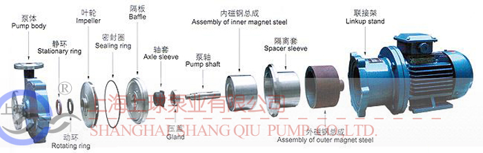 驅(qū)動(dòng)裝置采用主動(dòng)磁鐵聯(lián)軸器直接裝在電機(jī)軸上,泵室完全封閉,通過磁力偶合間接驅(qū)動(dòng)轉(zhuǎn)子組合上的葉輪旋轉(zhuǎn)。