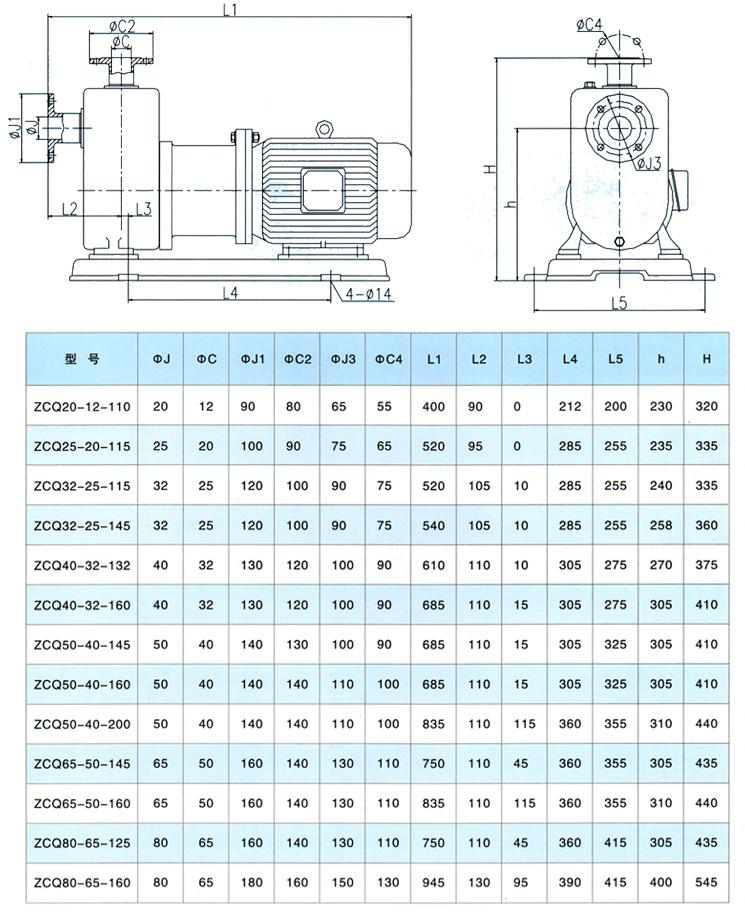 ZCQ型自吸磁力傳動離心泵性能參數(shù)表: